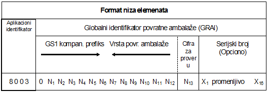 Strukturu niza elemenata za globalni identifikator povratne ambalaže (GRAI) čine dva dela: obavezna identifikacija vrste sredstva i opcioni serijski broj, za razlikovanje konkretnog sredstva u okviru iste vrste sredstva.